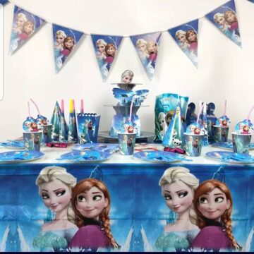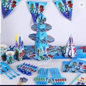 10pcs Paper Cups, 10pcs Paper Tray, 20pcs Tissue, 1pc Triangle Flag, 1pc Tablecloth, 6pcs Party Hats, 10pcs Knives, 10pcs Forks, 10pcs Spoons, 10pcs Straws, 6pcs Blow Dragon, 6pcs Speaker, 10pcs Masks, 10pcs Flags, 10pcs Gift bags, 6pcs Popcorn Boxes and 10pcs Invitations
